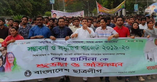 প্রস্তাবিত ২০১৯-২০ অর্থবছরের বাজেটকে স্বাগত জানিয়ে আনন্দ মিছিল করেছে বাংলাদেশ ছাত্রলীগ। এই বাজেটকে শিক্ষাবান্ধব, কৃষিবান্ধব ও প্রযুক্তিনির্ভর আখ্যা দিয়ে প্রধানমন্ত্রী শেখ হাসিনার পাশে থাকারও ঘোষণা দিয়েছে ছাত্রলীগ। ১৩ জুন, বৃহস্পতিবার বিকালে আনন্দ মিছিল